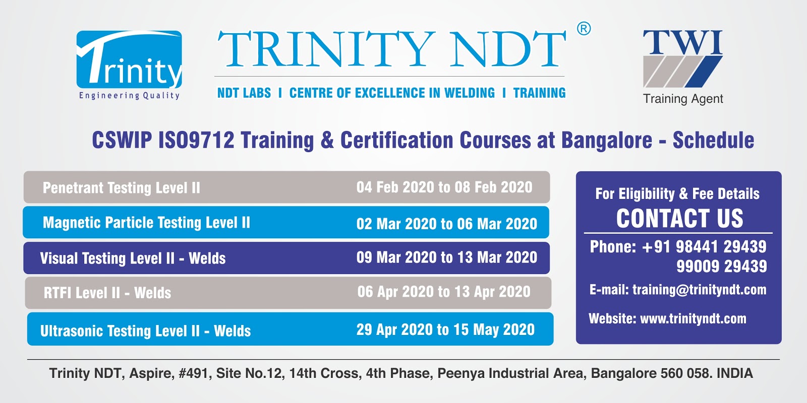 ISO9712 NDT Level 2 Training Course India at Trinity NDT Bangalore by TWI. Methods: Ultrasonic testing - Welds, Radiography Welds, Magnetic particle testing General, Penetrant testing General and Visual Testing Level 2.